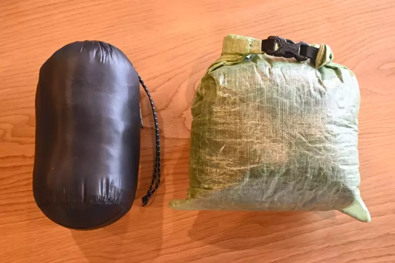 持ち運びの際、僕は念のためにロールトップ型のドライバッグに収納して雨や汗に濡れないようにしています。ダウンは濡れてしまうと保温力がものすごく落ちてしまうので、ドライバックはとても重宝します。この山旅ドライバッグSはダイニーマで作られていて、わずか17gととても軽量でダウンジャケットをしまっておくのに便利です。