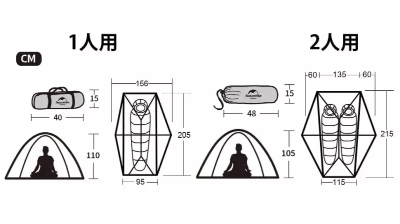 今回紹介するテントの中では、最も横幅が広く互い違いに減ることで、2人まで就寝することができます。