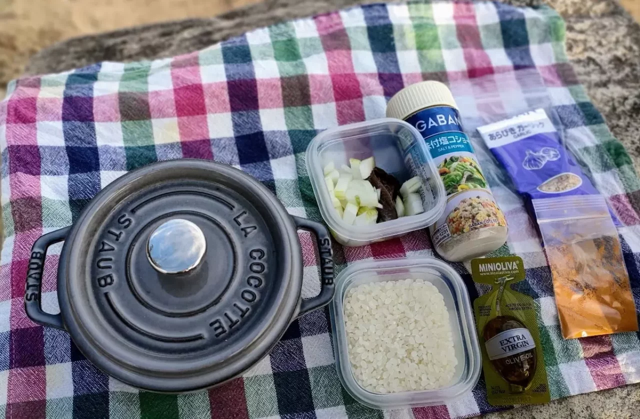 水をお米と同量入れます。ジップロックのミニコンテナ(タッパー)にお米を入れてきましたが、それに水を入れると計量が簡単です。お米と同じ量の水を計って鍋に入れます。