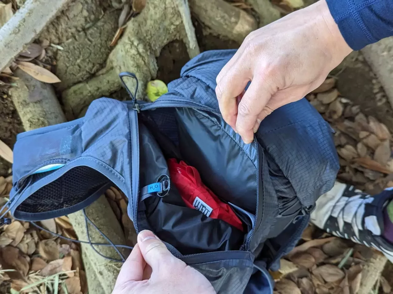 長距離を楽しむファイストハイクにもおすすめのトレイルランニング用ザックです。このザックがもっとも特徴的なのが雨にも強いデザインで、開口部はロールトップ型のポケットで止水ファスナーが採用されています。中に入れたものを濡らさず持ち歩けるトレイルランニング用ザックで、長距離レースはもちろん複数日に及ぶファストハイクなどにも使いやすく安心感の高いザックに仕上がっています。