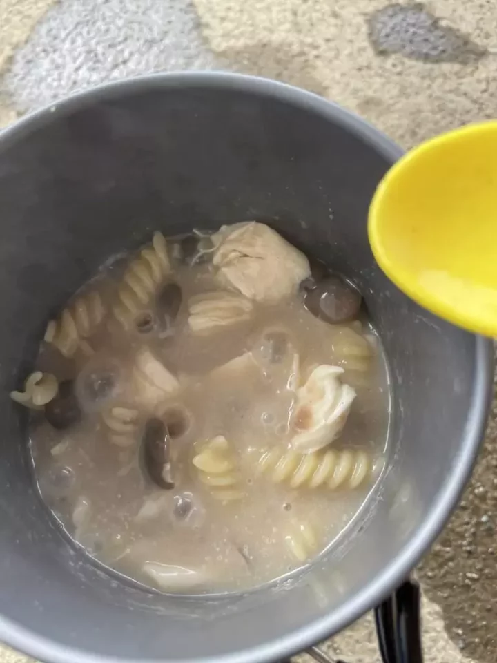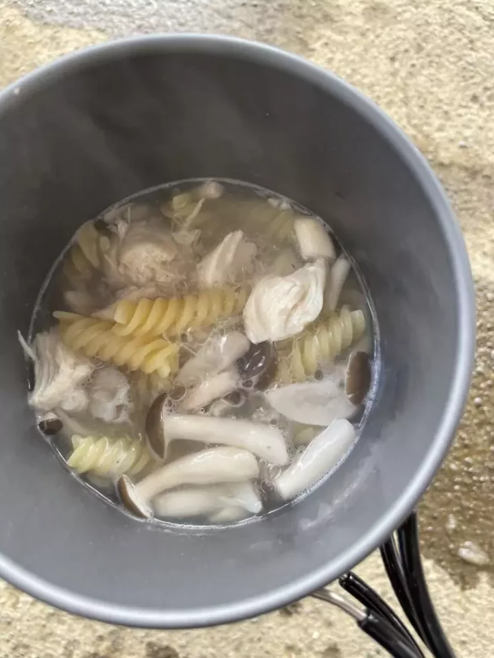 でも空気は澄んでいて、雪の上を歩く心地よさもあります。気を取り直して山ごはんを作ります。ショートパスタを茹でながら加熱した鳥ささみとインスタントスープの素を入れてスープパスタ風にします。