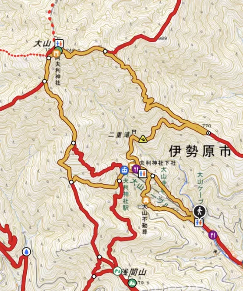 「大山ケーブルバス停」で下車し、ケーブル乗り場を通って登山口まで向かいます。下記の地図では右側のルートである「見晴台」を通って頂上を目指すコースが有名なようですが、今回は下山ルートに見晴台を入れ、逆側から登ることにしました。