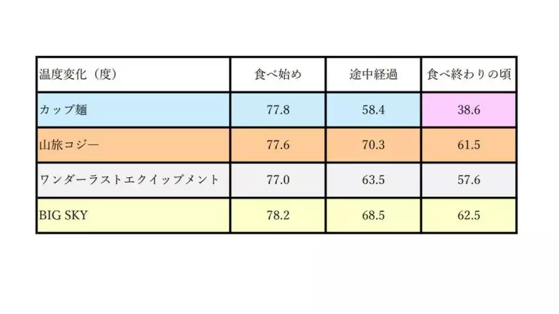 sweet climberさんに、そのままカップ麺を食べる場合と、スタンドコジーを使った場合とで温度の状態をテストしてもらったのですが、山旅スタンドコジーが最も途中経過の温度が高く、食べ終わり時点での温度も、そのまま食べるのと比較しても約倍ほどの温度を保っていることがわかります。