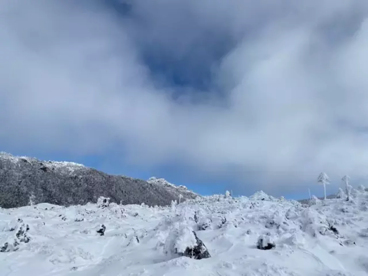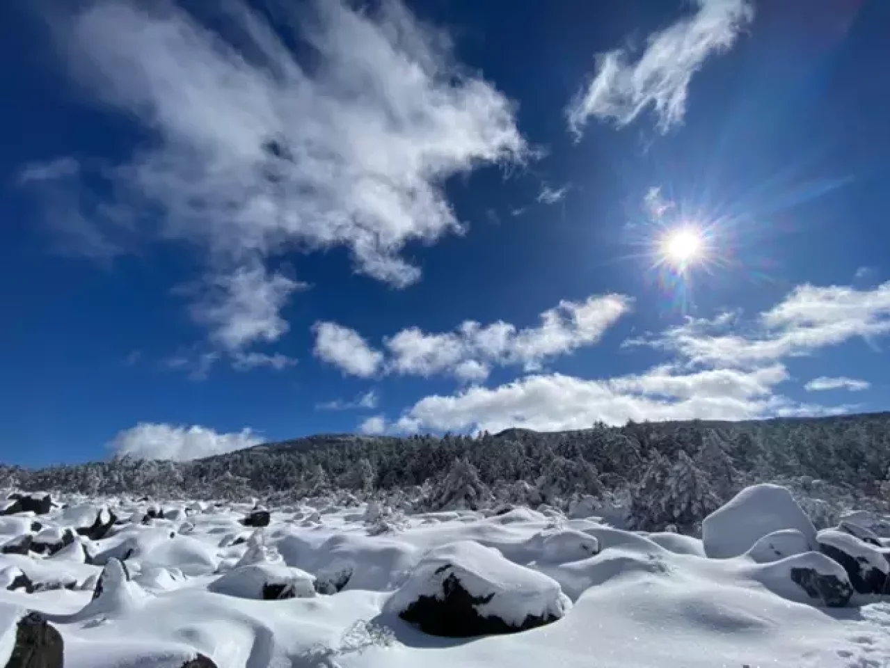 ロープウェイから降りたら、まずは足慣らしとして坪庭を周回しよう。20分〜30分あれば十分周回でき、足元もスノーシューやアイゼンなど状況に合わせたもので問題ない。技術的にも特に難しいところはないが、冬の八ヶ岳らしく気温はかなり低いので、特に風が強い時などは冬用のウェアリングが必要だ。天気が良ければ、ロープウェイの駅越しに中央アルプス、南アルプスを望むことができる。