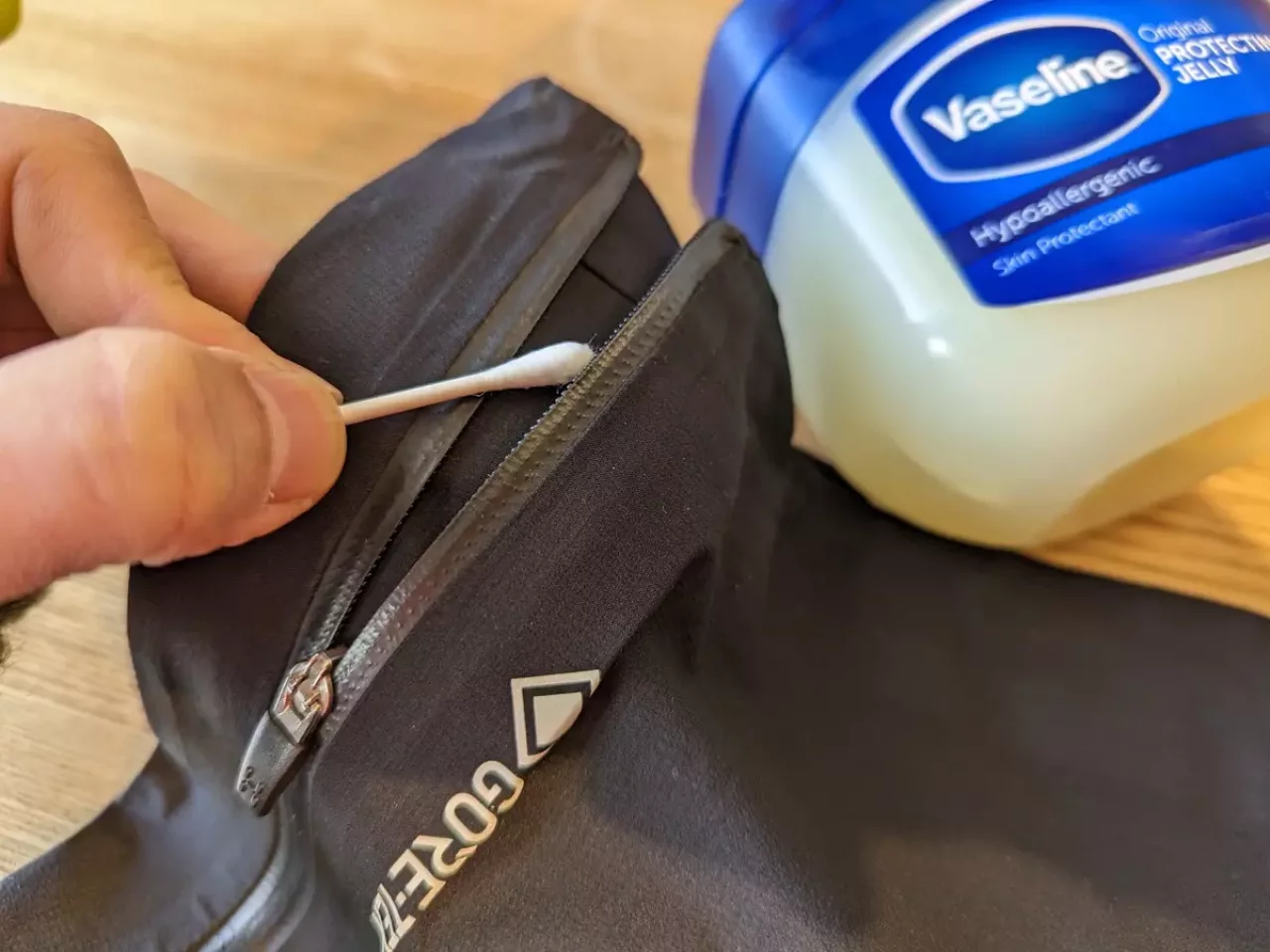 ワセリンをたくさん塗ってしまうと、ファスナー部分がベタベタしてしまうので容量に注意する必要があります。綿棒を使ってファスナーに塗ることができます。