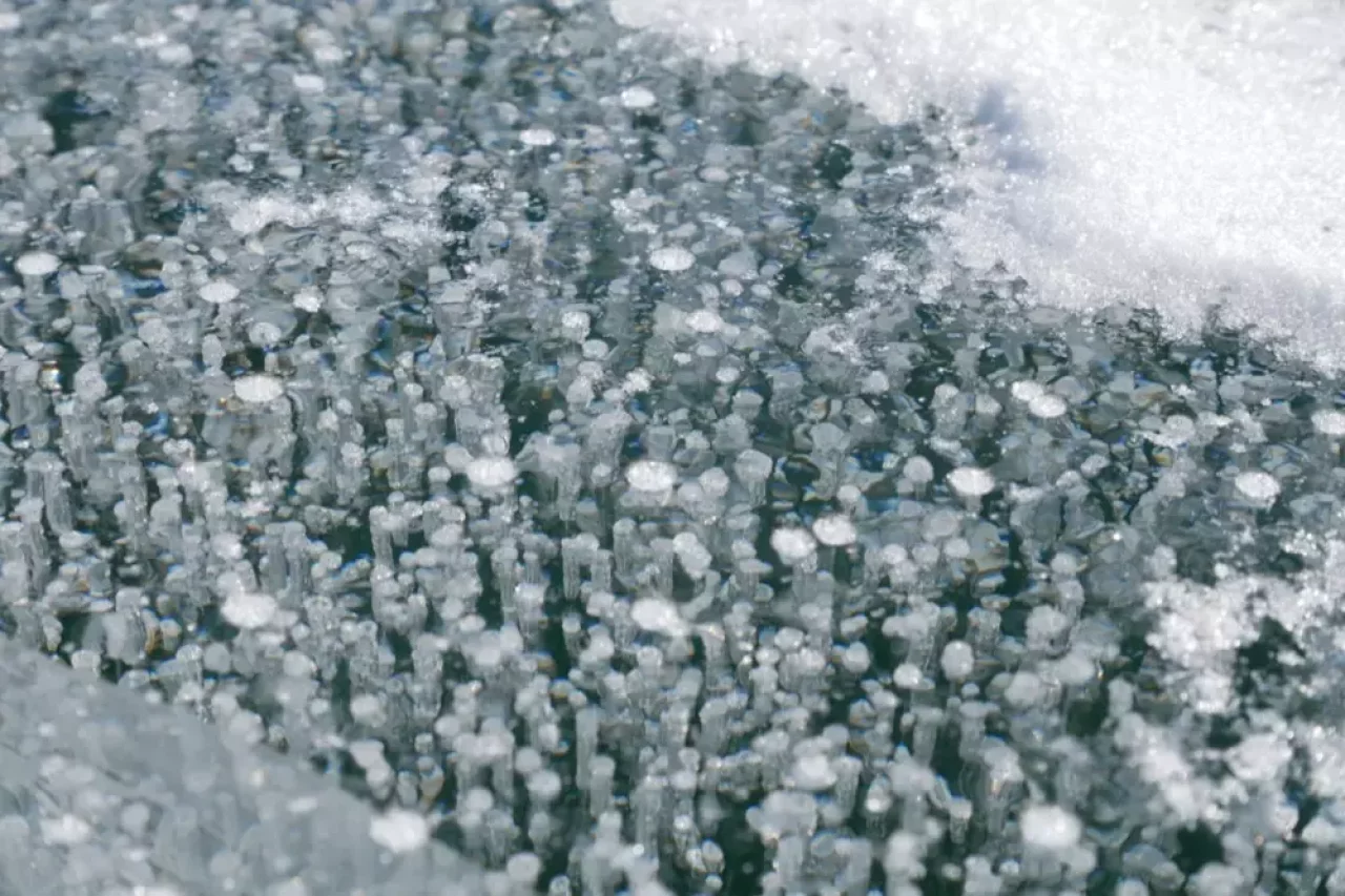 湖の表面をよく見るとアイスバブルが確認でき、近くからゴボゴボという音も聞こえてきます。