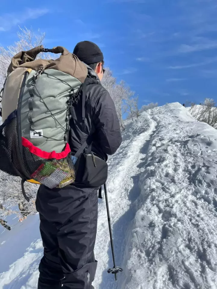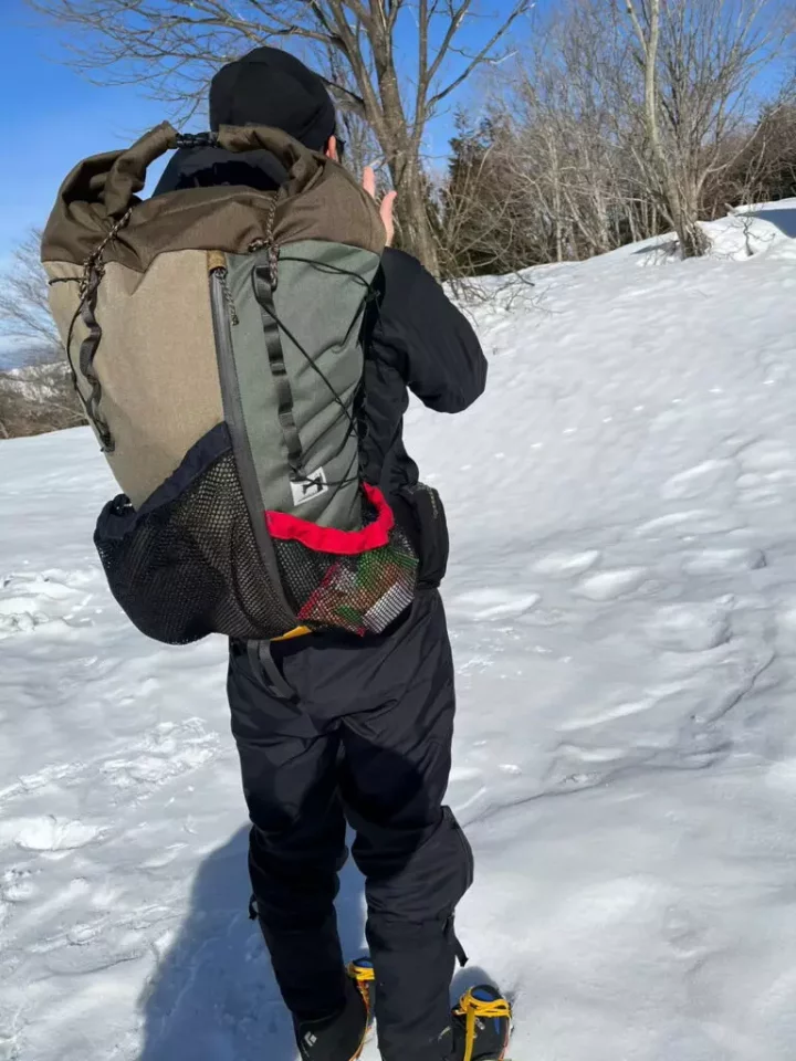 雪山に映えるデザインはもちろんのこと、生地の強さ、高重心設計、各ベルトの厚み等によって荷物の重さを感じさせない「軽量感」が一番の魅力。