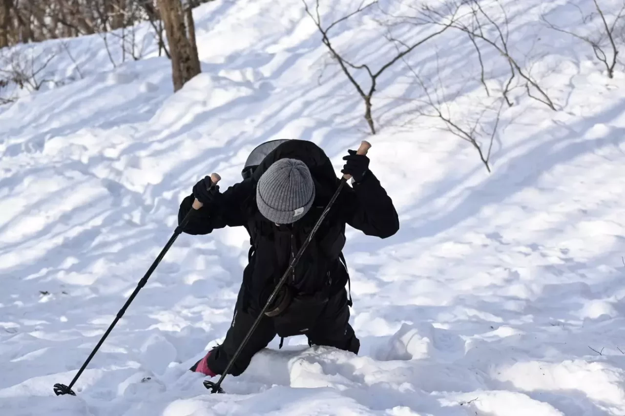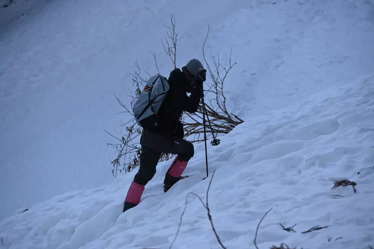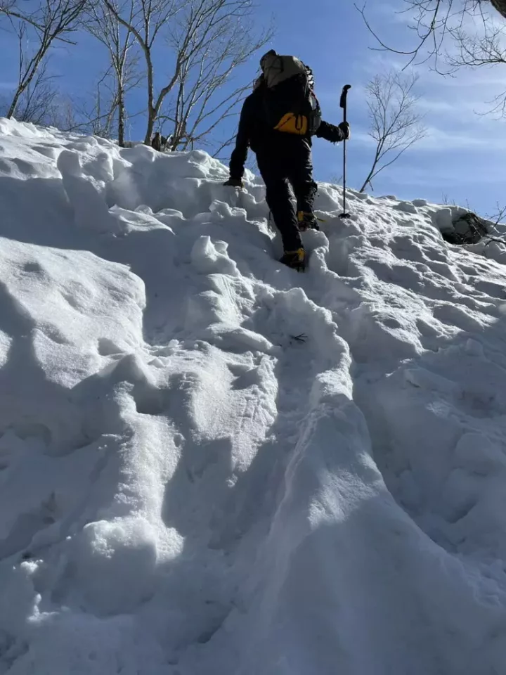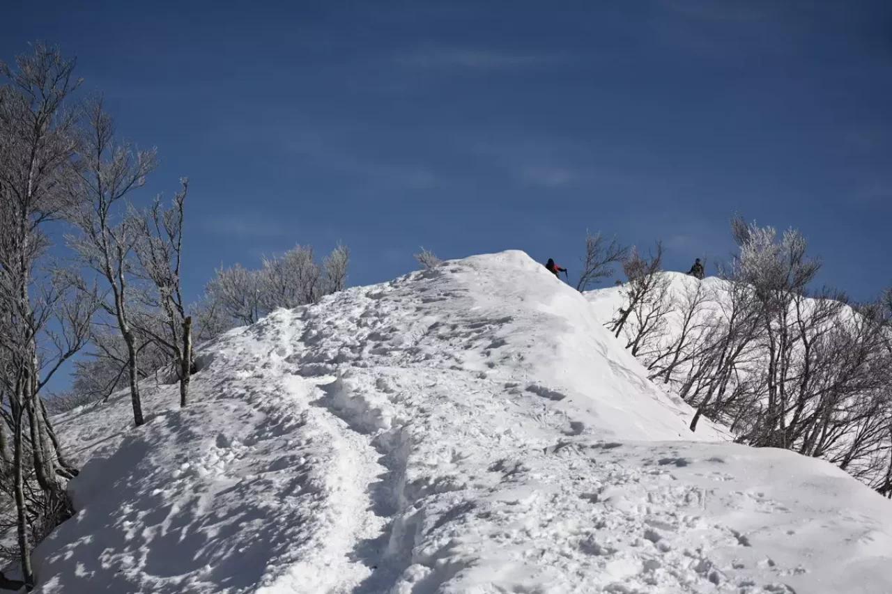 ショートカットで登っていると、上から降りてくる人がいて、スレ違うには道が狭いので山側に少し登って待機。待たせてるからと焦ったのかスレ違うタイミングで足を滑らせて転けて危うく滑落しそうになる、のに巻き込まれかけた。トレースで出来た段差をドンッドンッとしりもちついて三段くらい落ちはった。