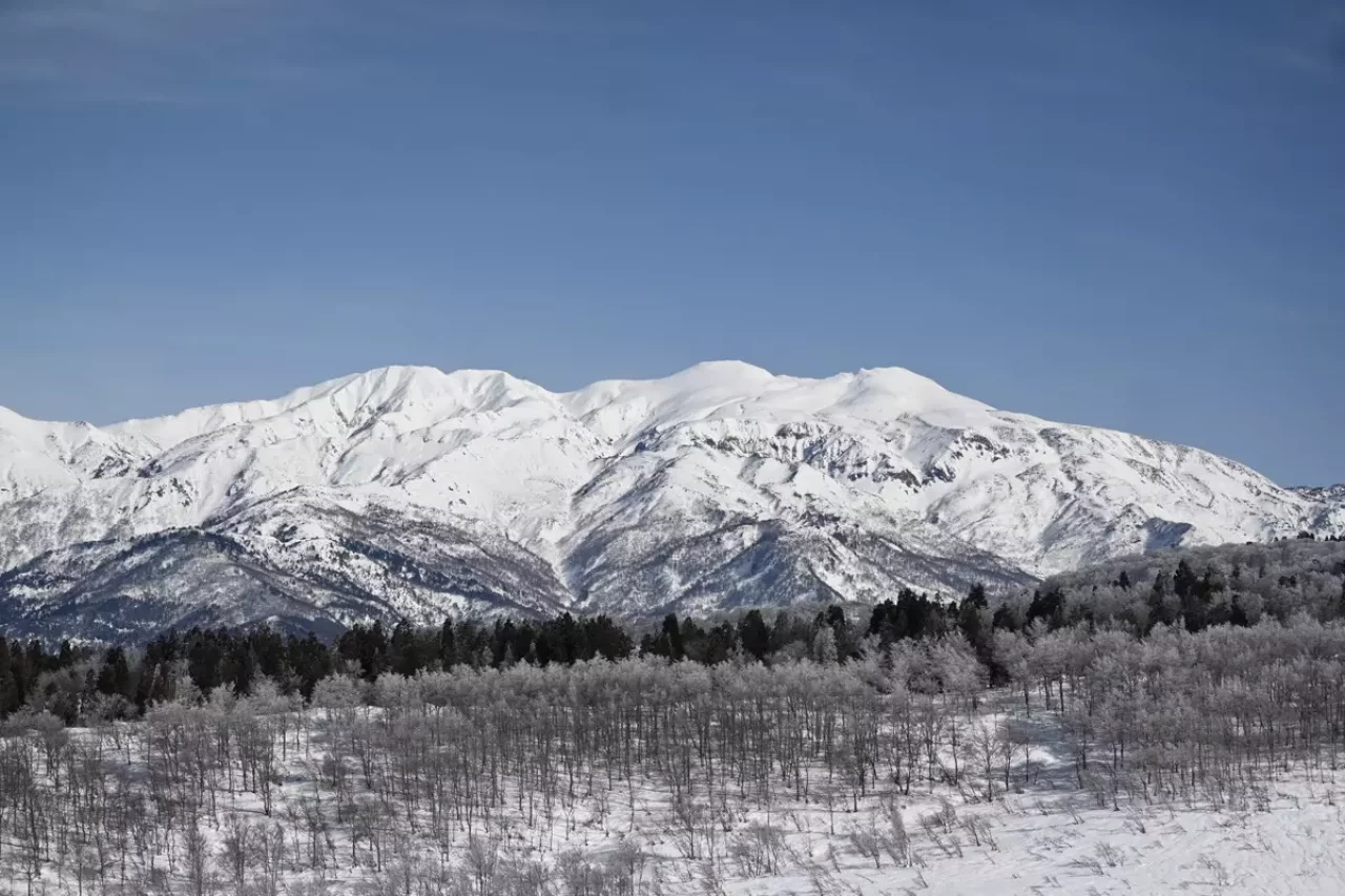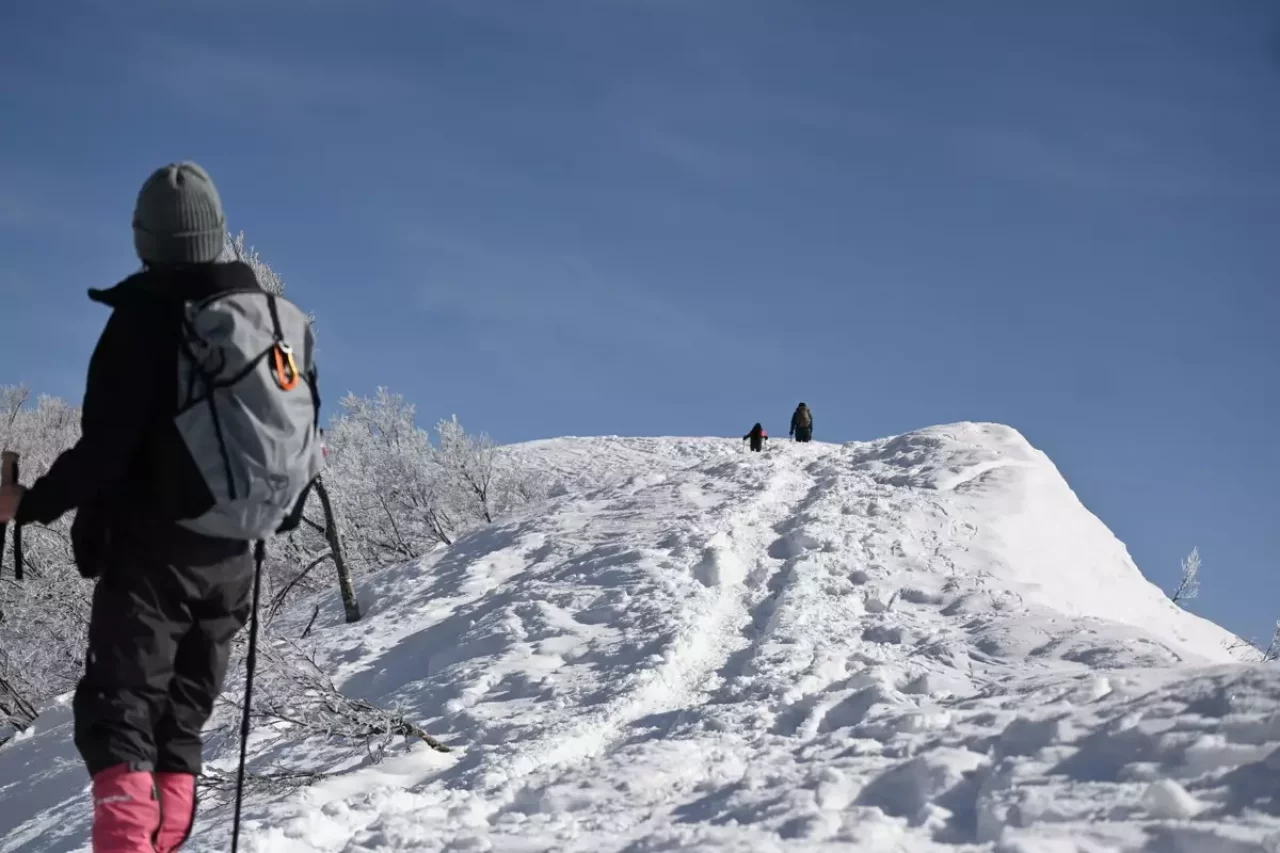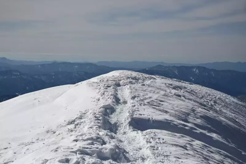 山頂手前で一旦傾斜は緩み辺りを見渡すと真っ白の山が連なっている。山の上は青。