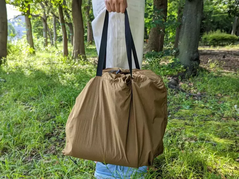 2種類のトートバッグがあり、1つは手で持つ、肩にひっかけることができて、開口部は細引きで開閉するシンプルな作りです。重量は約79gでパッカブルできる仕様です。