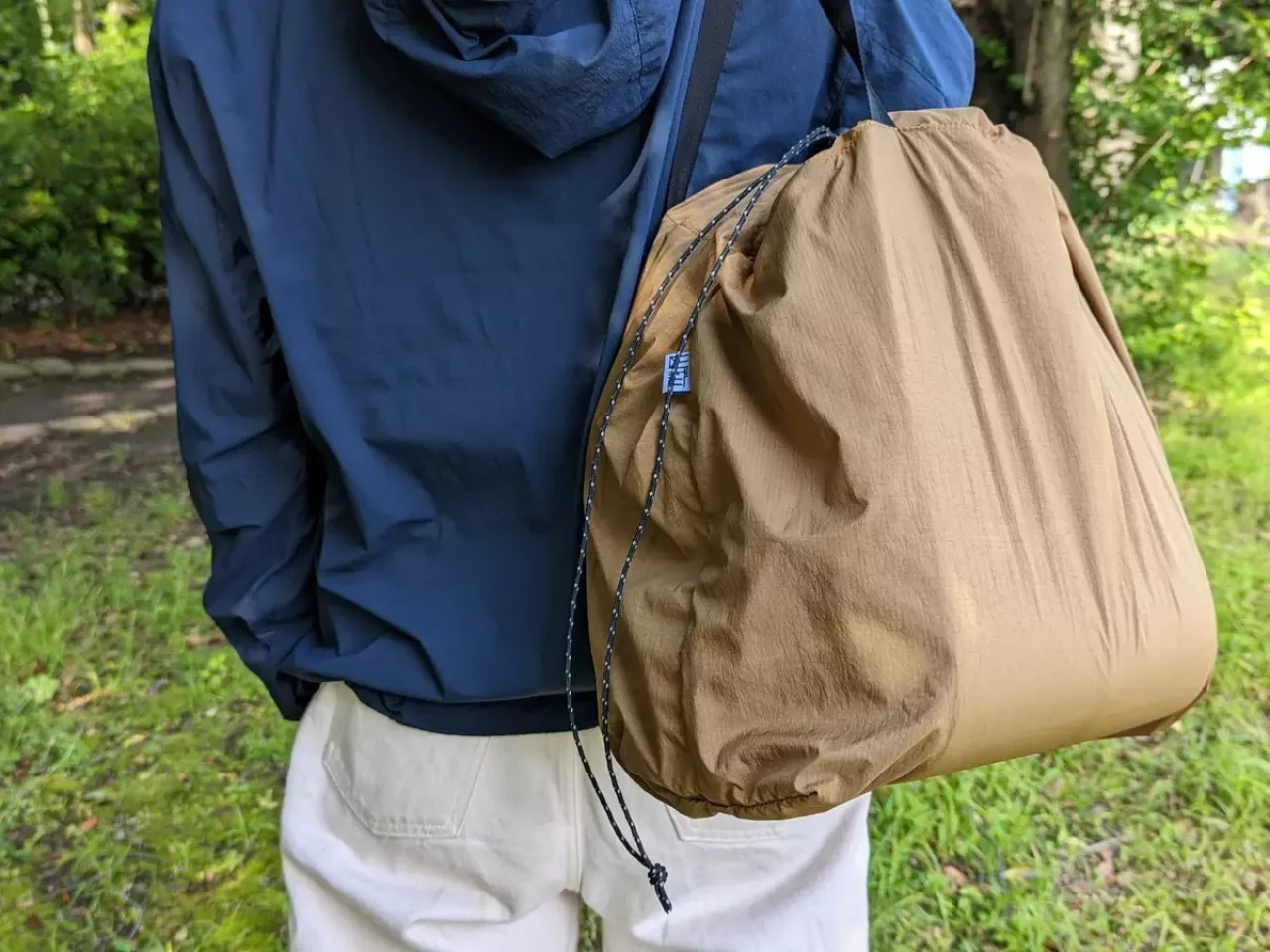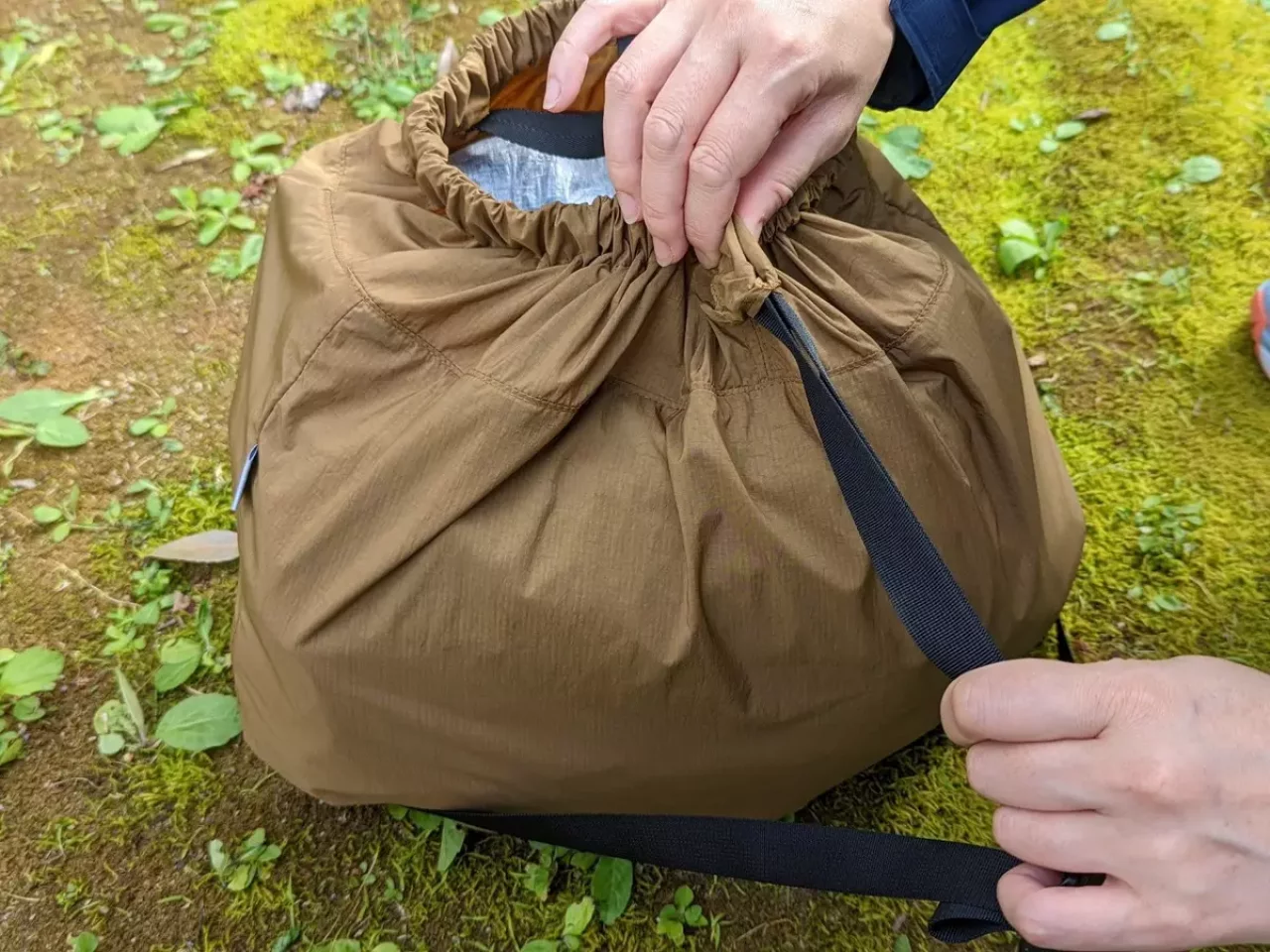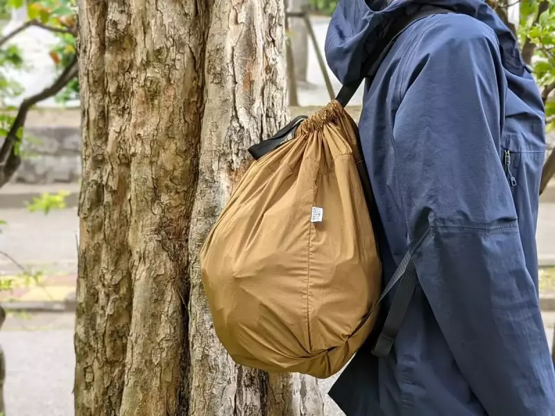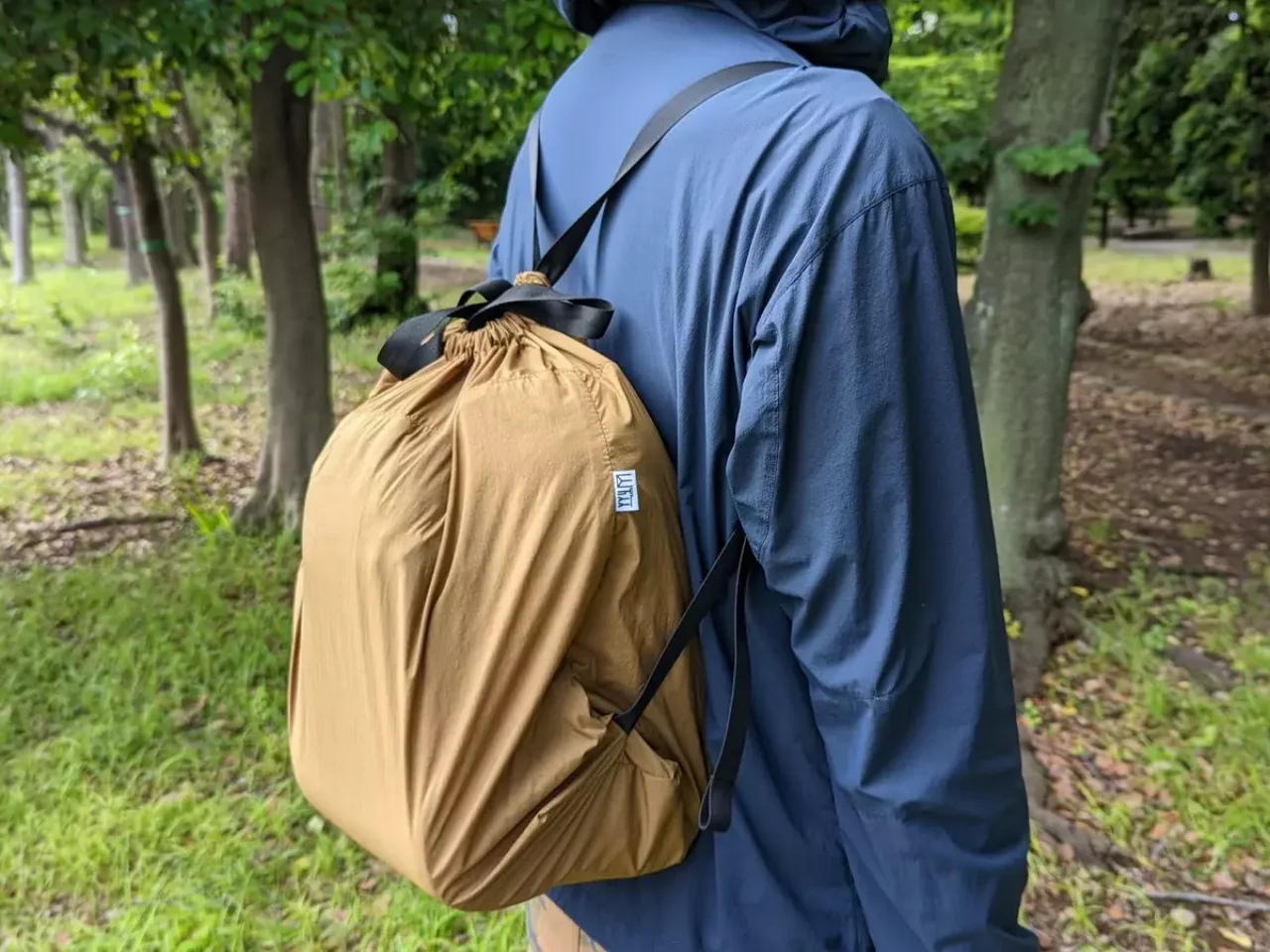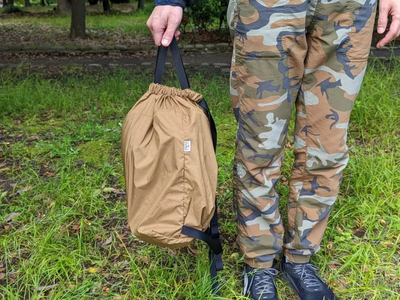 もう1つは大きさは同じなのですが、手で持つこと以外にザックのように肩にかけることができる2way仕様で、ショルダーベルトで開口部も閉めることができるようになっています。こちらの重量はショルダーベルト部分の長さがあるため、重量は約105gです。