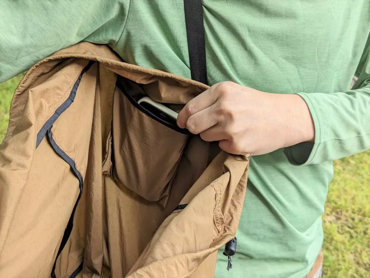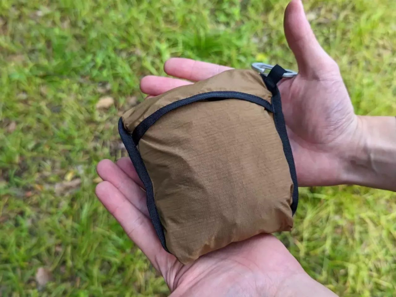 このポケットの中にパッカブルができる仕様です。パッカブルした時にカラビナを取り付けることができるので、ザックなどに引っ掛けておくことが可能です。