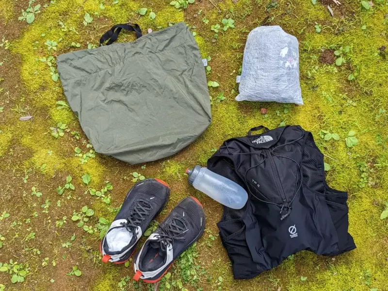 公共交通手段を使ってトレイルランニングに出かける時に、帰りの電車の中で他人に迷惑をかけないように、着替え終わった汚れた衣服、トレイルランニング用ザック、トレイルランニングシューズ(帰りはサンダルなどに履き替える)など、すべて大きめのトートバッグに収納しておくことができます。