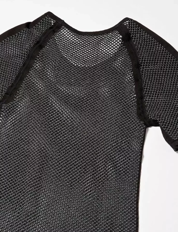 他のメッシュ素材のウェアとは異なり生地の厚みと大きな編み目が特徴です。肌から出た汗はメッシュの繊維を通って重ね着したベースレイヤーへと移動します。