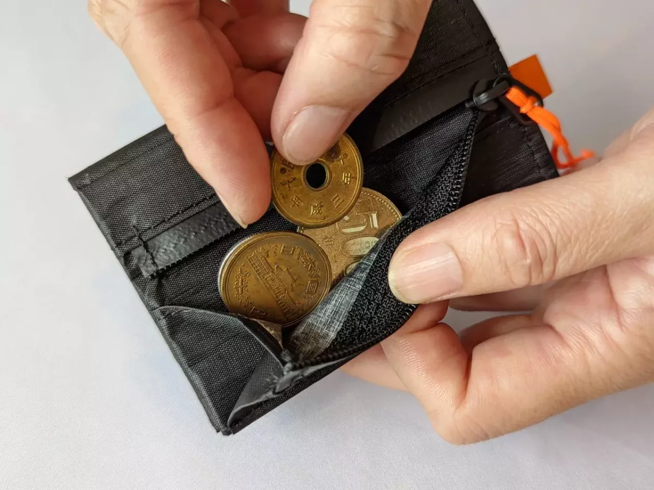 お札は折りたたまず収納可能です。小銭は外側の止水ジッパーポケットに入れることができ、マチ付きなので取り出しやすい設計です。