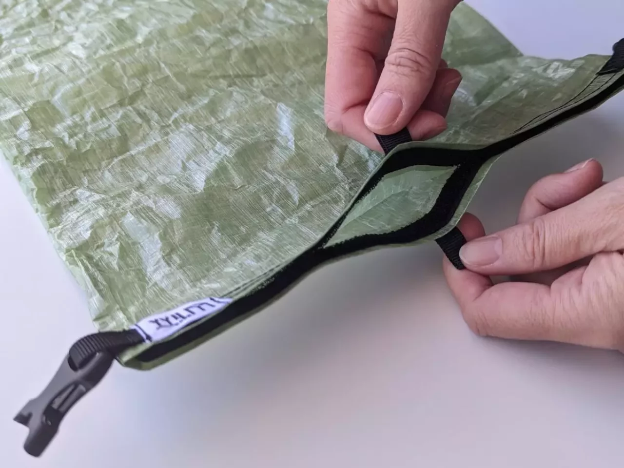 ドライバッグの開口部はマジックテープが縫われており、開口部を閉じてからロールを折って畳むことで、防水性能を高めるとともに、空気の移動が少なくダウンウェアやシュラフを圧縮して収納することができます。(コンプレッションザックではありません)
