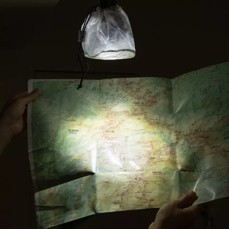 半透明素材で柔らかく、ヘッドライトと組み合わせることでランタンシェードになります。別途ランタンが必要なくなるので、軽量化アイテムとしてご活用頂けます。