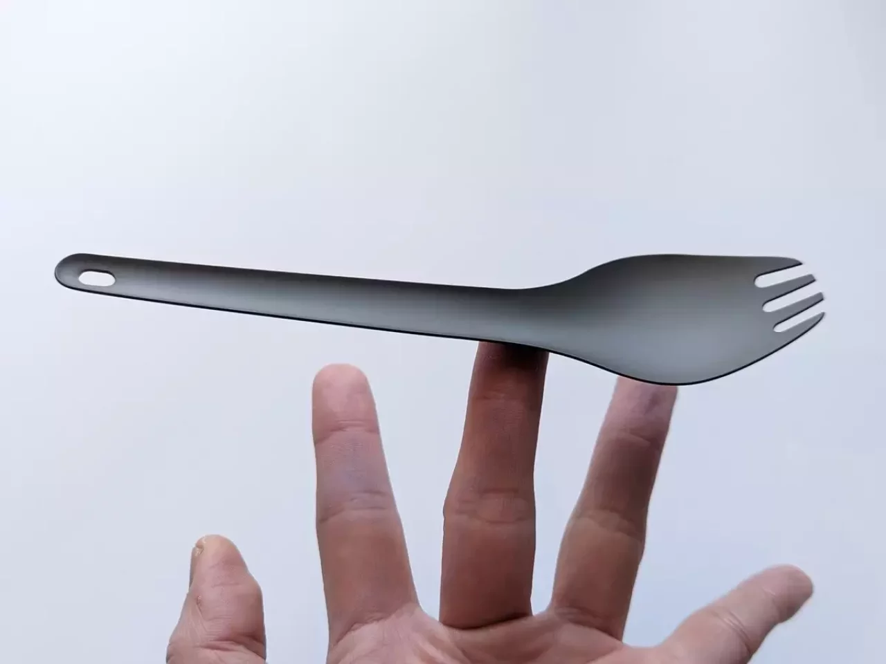 軽いけど食べやすい、わずか7グラムの超軽量な先割れスプーンです。スプーンとしてもフォークとしても使い心地に優れ、先端に向かってストレートにテーパードされた形状なので、麺類を巻きつけやすくなっています。