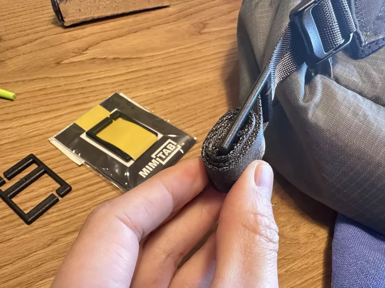 ザックのショルダーストラップやウエストストラップを体にフィットさせた後に、余ったテープがダラダラとして邪魔だと感じたら『MIMITAB』の出番です。