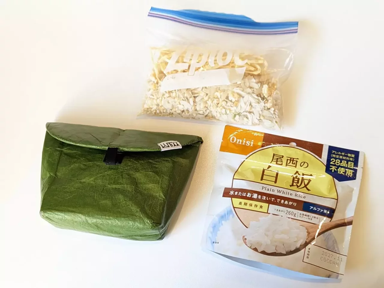 ジップロックのフリーザーバッグSに、Amazonで購入できるライスフレークをベースに、フリーズドライ、乾燥食材などを入れて自分好みの味にアレンジしたら行動食の出来上がりです。