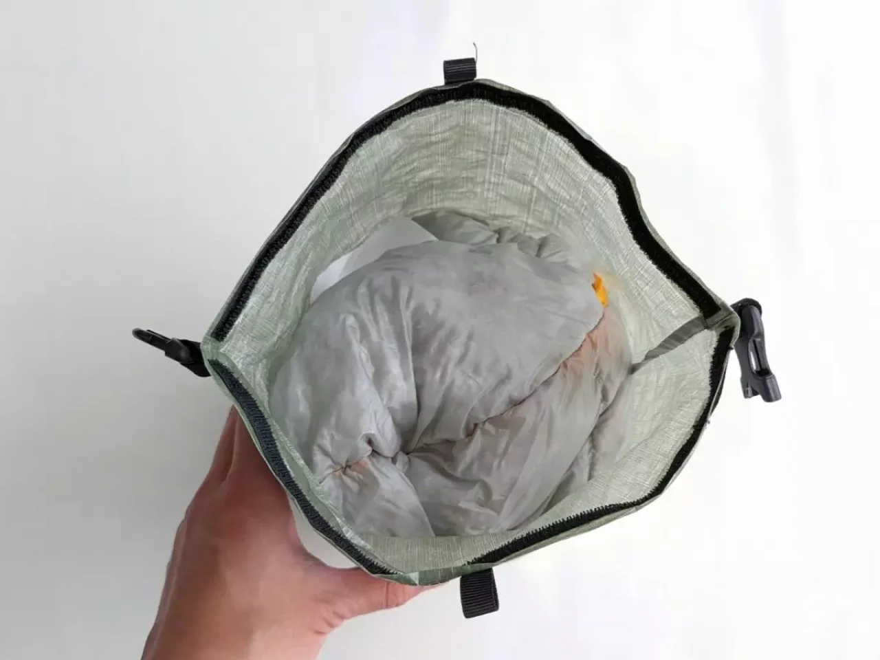 Mサイズは5L前後で、300g以内の軽量なダウンウェアを2着、5〜600gのシュラフを収納するのに適しています。重量20g。