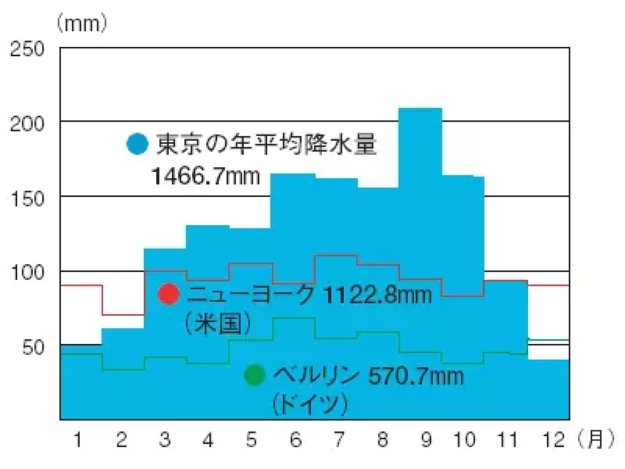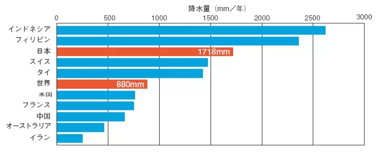 上の図は国土交通省出典の洪水を受けやすい国土であること示した図です。上は年間降水量月別の比較で右は世界各国の降水量です。