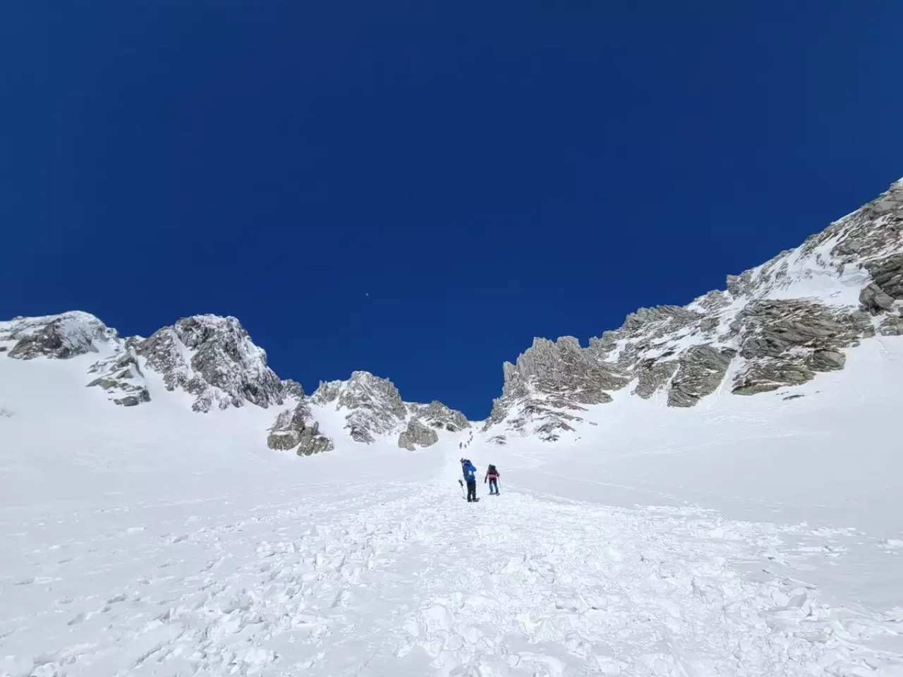 アイゼンを装着して外に出ると白と青の世界。標高が高いので空は濃いめの青。群青。ロープウェイ駅から2本のトレースが延びていて、向かって左の山側トレースは雪崩の恐れがあるため使用禁止とのこと。もちろん下側のトレースを進む。