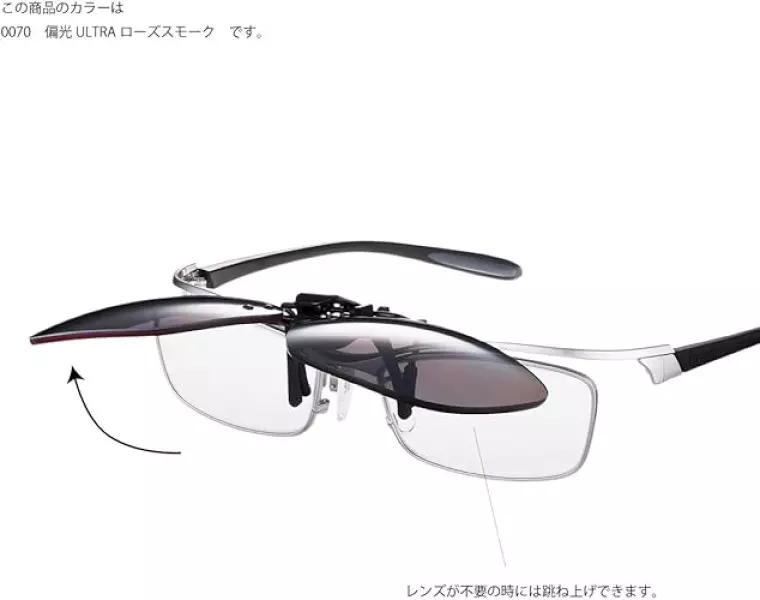 度付き眼鏡の上にサングラスのレンズが装着されており、必要ない時にはサングラスのレンズを跳ね上げておけるため、外したサングラスのレンズを収納する手間がなく、紛失の心配もありません。