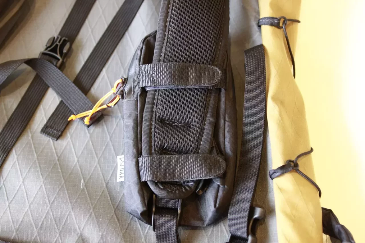 縦にも横にも取り付けることができるストラップ付きで、ショルダーハーネスだけでなくウエストベルトにも取り付けることができるように作られています。 ショルダーハーネスに取り付ける時のベルクロテープが短いので、ザックの大きさを確認するようにしましょう。