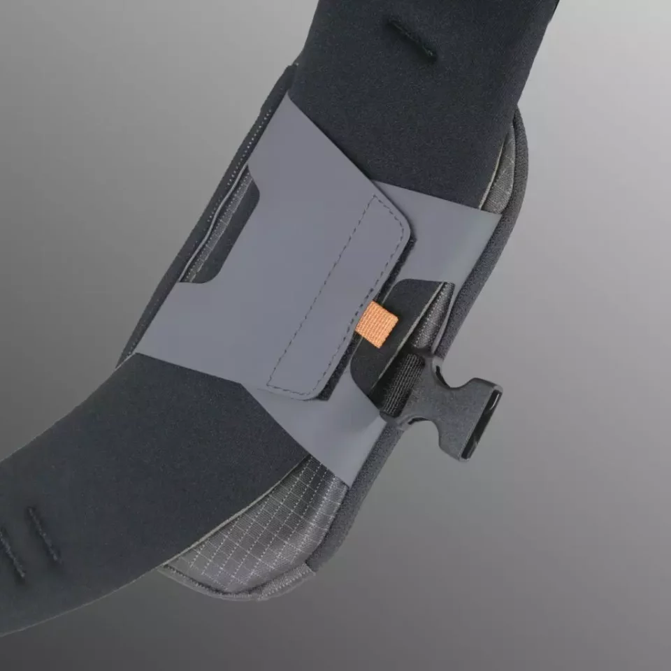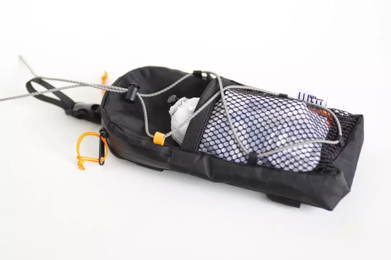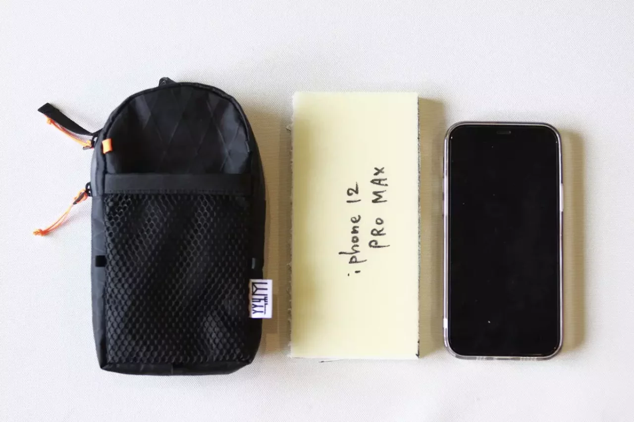 スマートフォン以外にも財布や小物、地図などを固定してショルダーハーネスに装着できるX-PAC製の軽量スマホポーチです。外側にはメッシュポケットが備わっており同ブランドの軽量な財布がシンデレラフィットするように作られています。使用しているX-PACは210d リップストップ・ナイロンの表地で軽量で耐久性があり防水性を備えています。