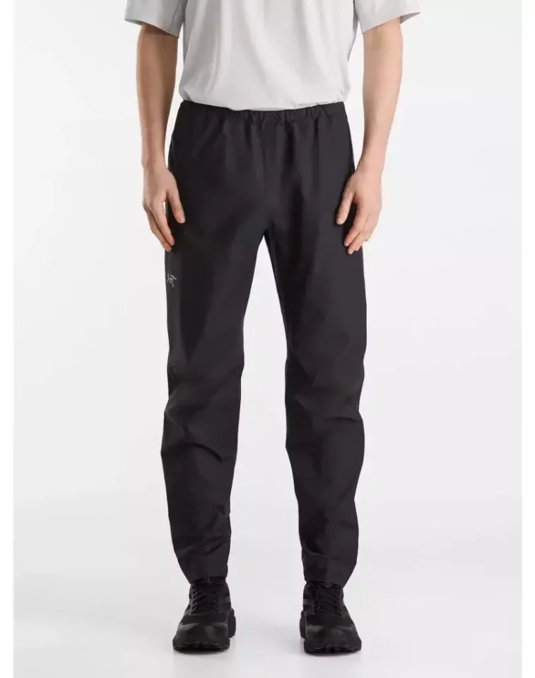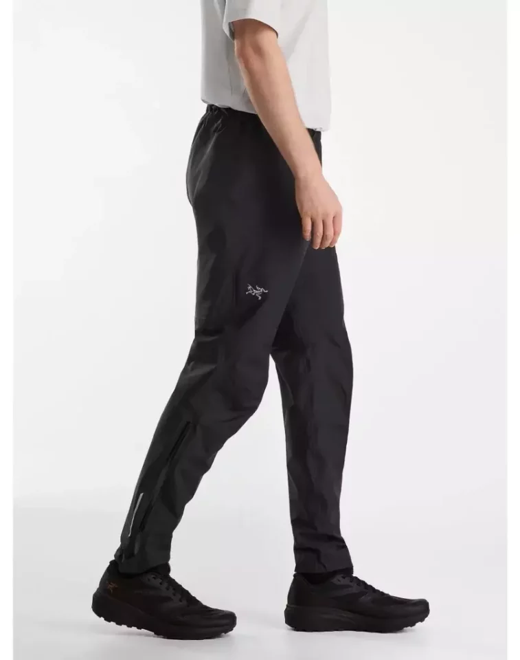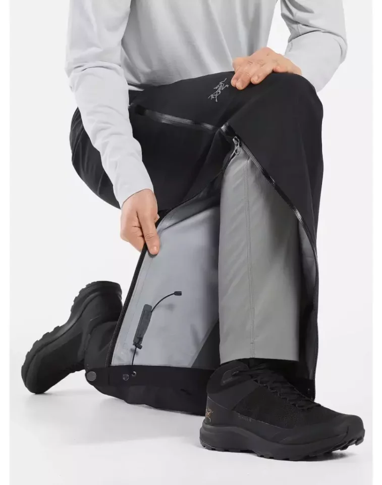 登山用パンツ、登山靴を履いたままでも容易に脱ぎ履きができる大きなサイズのサイドジッパーを備えたゴアテックス製のレインパンツ。アークテリクスが得意とする立体構造パターンを採用しており、レギュラーとながらも動きやすく肌寒い季節の登山パンツとしても使用することができます。
