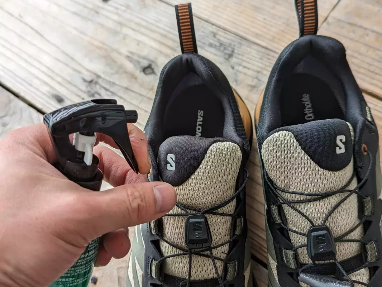 登山が終わった後には一度登山靴を脱いで登山靴の中にマルチ消臭スプレーを吹きかけます。こうすることで登山中と登山後の移動中に汗の嫌な臭いを抑えることができます。