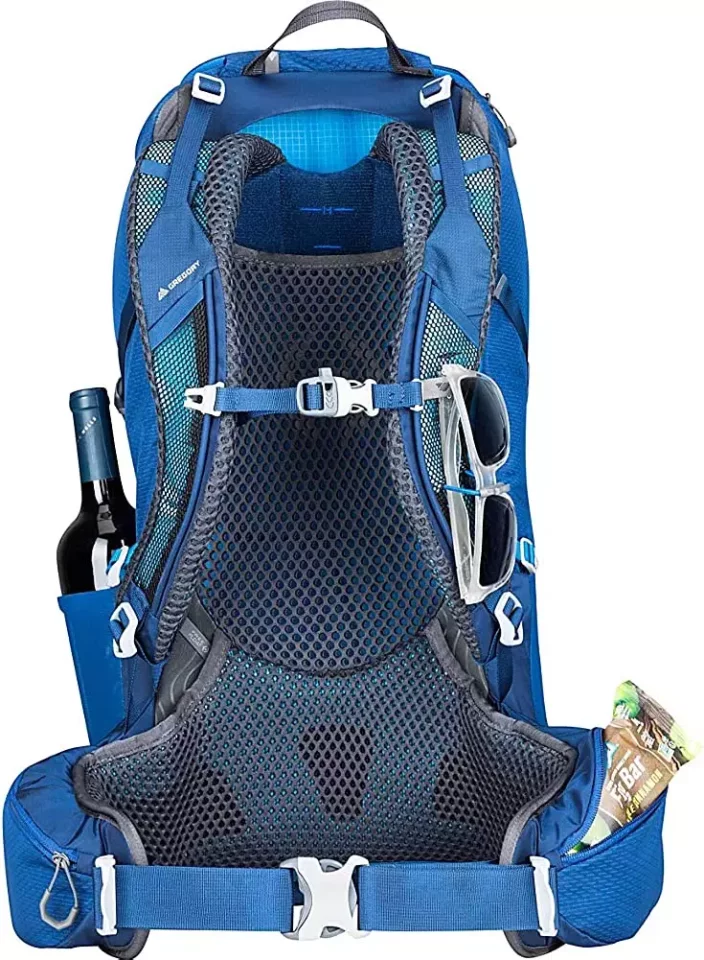 フリーフロートサスペンションと名付けられた背面システムは嵩の高いメッシュで体にフィットしながら通気性能に優れています。腰回りからヒップベルトが一体化している独自のデザインを採用しており、背負い心地に優れたザックです。フロントポケットの収納のしやすさやショルダーベルトに取り付けられたサングラス用のバンジーコードなど随所にグレゴリーのこだわりを見ることができます。