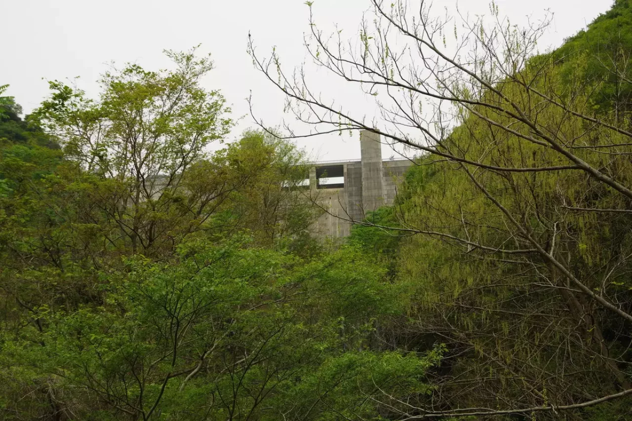 この道中にあるダムは2基、1基目は石井ダム。妙法寺駅から高取山の急登をクリアし、そこからいったん下山して、鴨越駅近くの林道を抜けます。沢沿いに舗装路を歩いていくと、茂みの奥に白亜のダムが現れます。これが石井ダムです。
