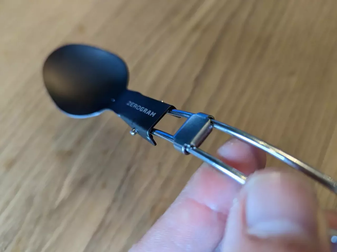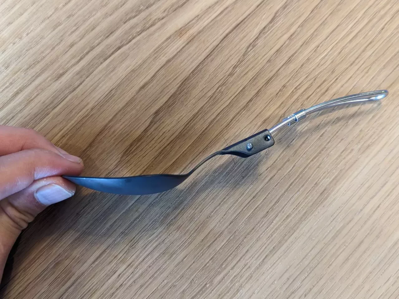 スプーンは広げた時にジョイント部分がしっかりと固定され剛性に優れています。15.5cmの長さはちょうどよく、また手に持った時に掬ったものがこぼれづらいように程よいカーブがついています。