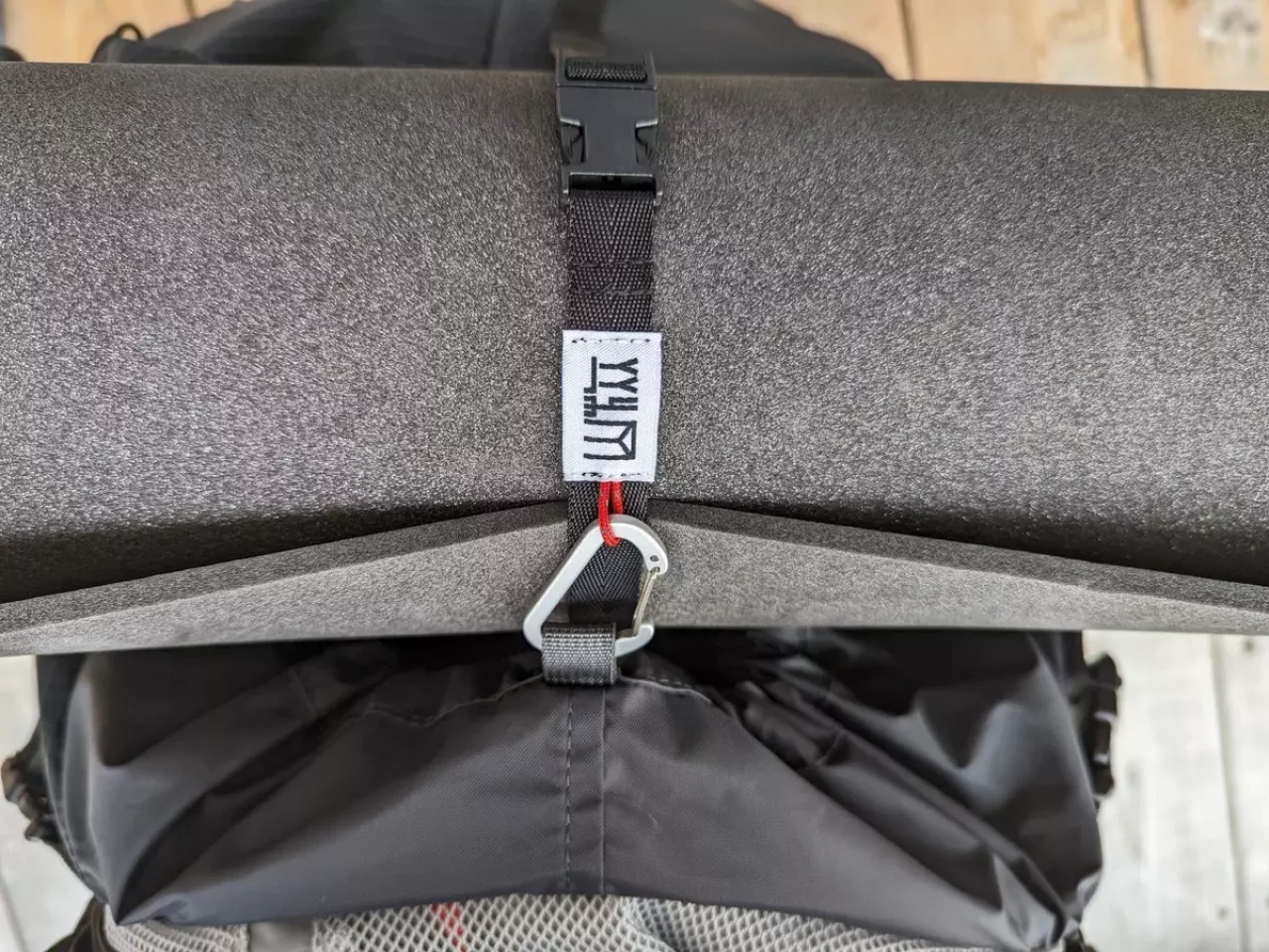 風に飛ばされやすいマットなので、ロールしてまとめた後にカラビナを使ってザックに固定しておくことができます。山旅ロックストラップにはループが備わっているので、カラビナを簡単に取り付けることができます。