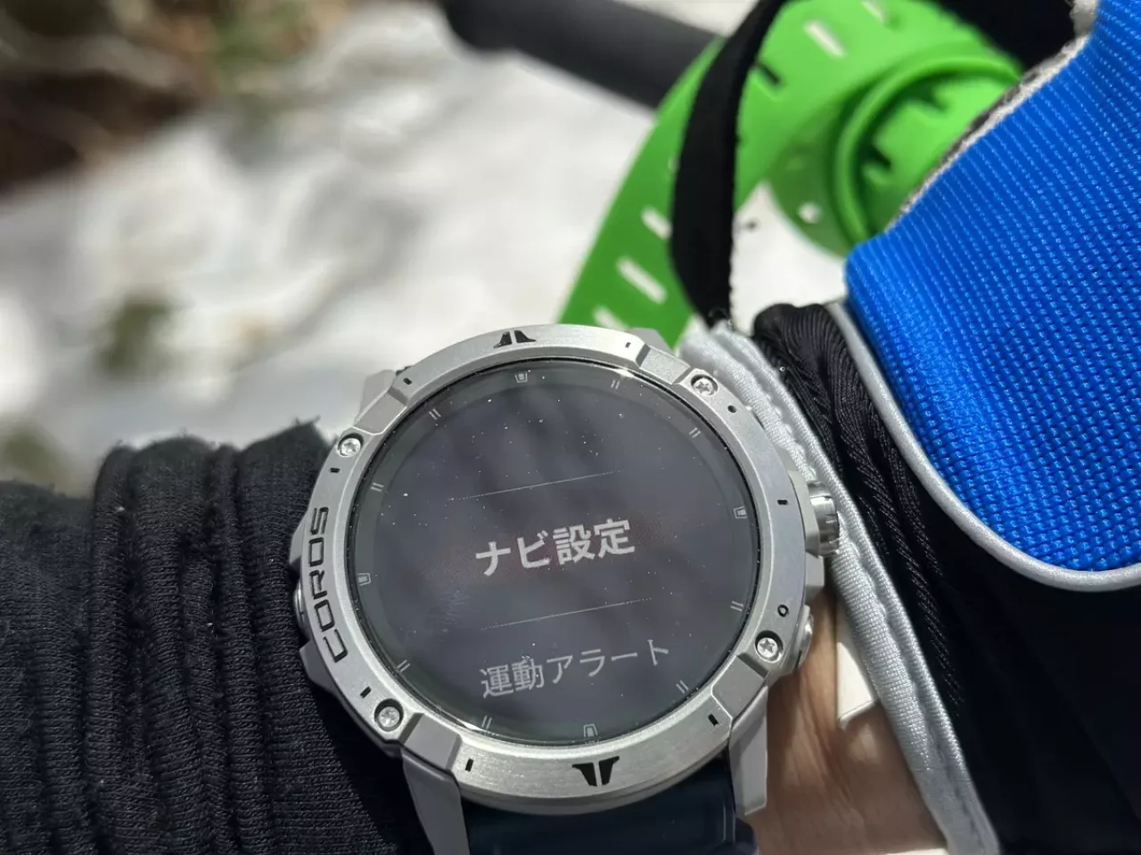 時計側のメニューでナビゲーションを選ぶか、アクティビティを選んでナビ設定から同期したルートを選ぶことができます。ルートを選んだ後に「コース開始」を選んで登山などのアクティビティを開始します。この時にコースを離脱した時にアラートを鳴らす設定をオンにすることができます。