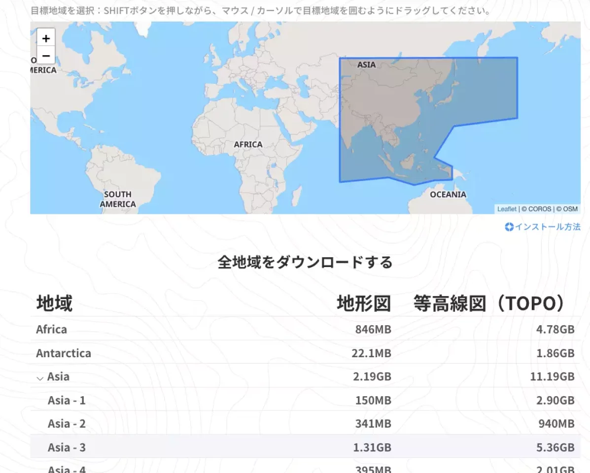 地図のダウンロードはCOROSのマップダウンロードページに行って「Asia-3」という地域を選んでダウンロードを行います。地形図が1.31GB、等高線図が5.36GB、合計で7GBあるので、ダウンロードをして時計に同期するまでに数時間ほど必要です。このデータは中国、アジア各国の地図データも含んでいるので、日本だけの地図で良い、という場合は日本だけを選択して地図をダウンロードすることもできます。この場合は800MBほどのデータ量なので時計に同期させるまでの時間を短縮することができます。