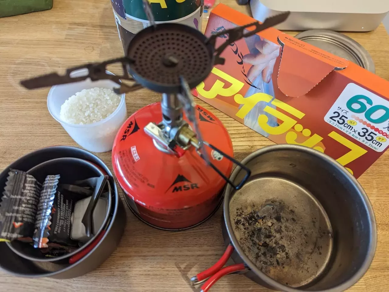 そんな固定概念を覆すのがポリ袋炊飯です。熱伝導率が悪いチタンクッカーでも炊きたてのご飯を楽しむことができます。今回はポリ袋炊飯の方法と、どんなクッカーでも炊飯ができることを証明するためにエバニューのコンパクトなチタンクッカーでポリ袋炊飯に挑戦してみます。