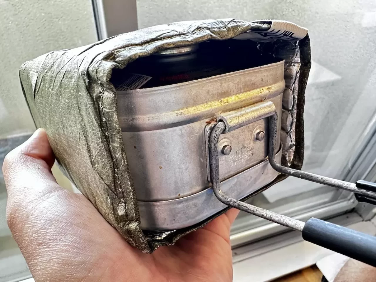 ガス缶はメスティン本体の上からはみ出てしまうので蓋をすることができません。蓋をしないと中のものがばらけてしまいますがこれを山旅のメスティンコジーで抑えるという方法です。