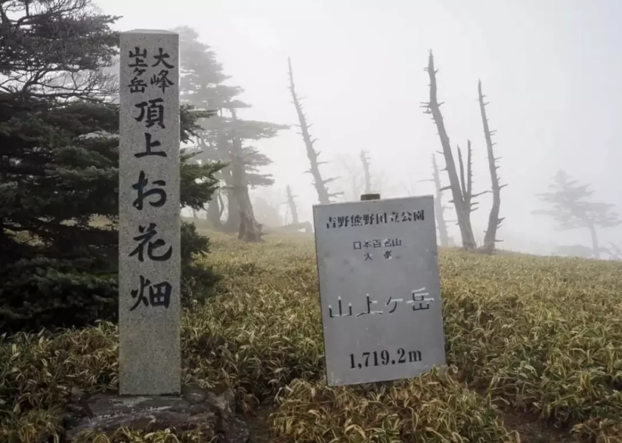 山上ヶ岳の山頂です。大峯山寺本堂(奥駈道)から少し外れたところにあります。視界が晴れないので先に進みます。※絶景ポイント「日本岩」があります。