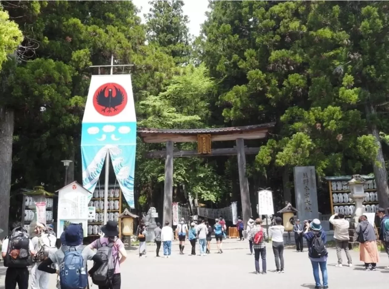 玉置神社をスタートしてから5時間、ようやく熊野本宮大社(大鳥居)が見えてきました。最後までアップダウンが続きます。