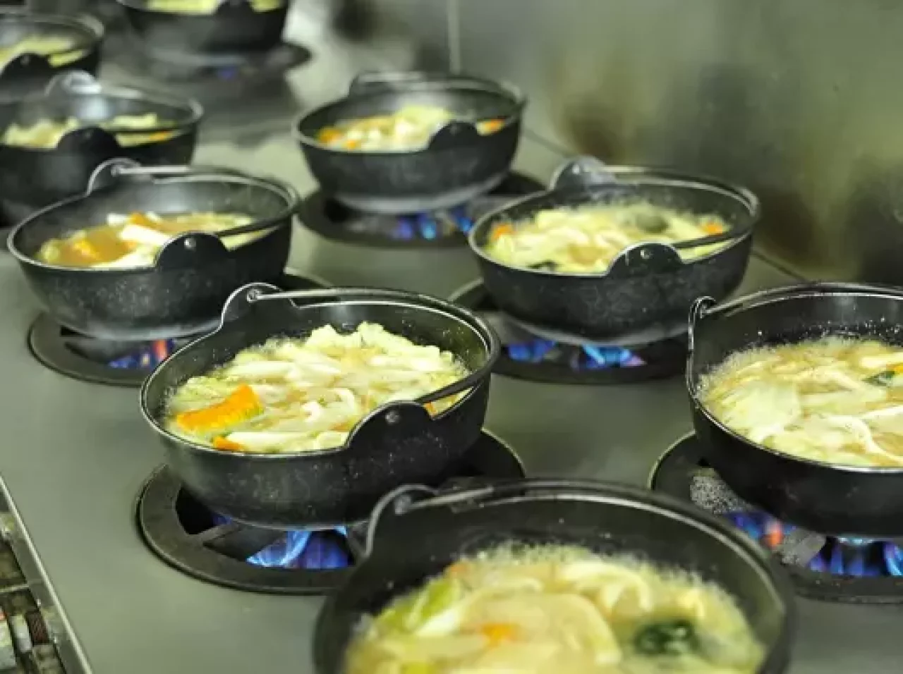 かぼちゃの入ったほうとうが人気の長寿村 権六。生麵をひと鍋ずつ煮込んで作っています。営業時間が11時から15時までと早めなので、早朝に節刀ヶ岳へ登って帰りに寄るのもおすすめです。