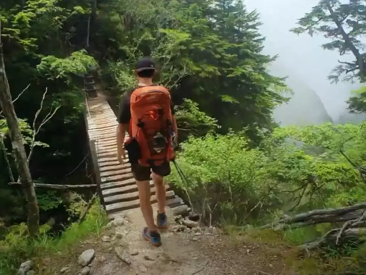 節刀ヶ岳を経由するルートの中には、ロープやはしごを使って進んだり、つり橋を渡るなどアスレチック要素が多く感じられる中級者向けのルートもあります。つり橋の横には、「1人ずつ渡れ」と書かれた看板も立てられており、恐怖感とワクワク感が漂ってきます。