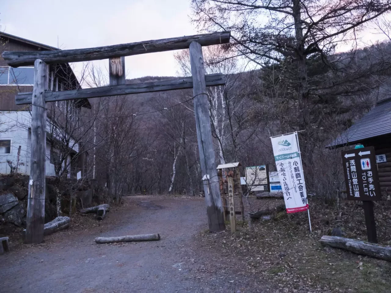 バス停前のT字路を浅間山荘方面へ進み、林道を4Kmほど歩けば(約1時間)浅間山荘に到着です。火山館コースの始まりは、浅間山荘右側の鳥居からになります。