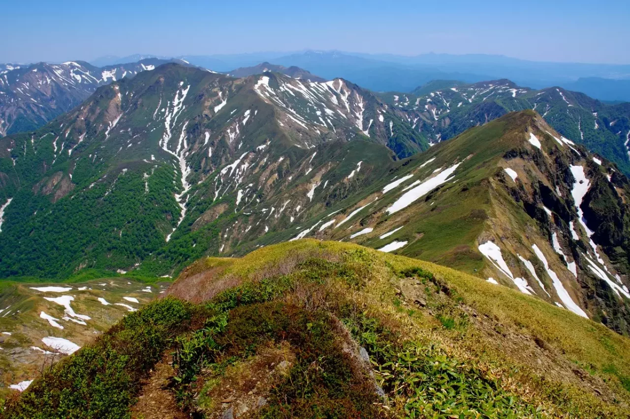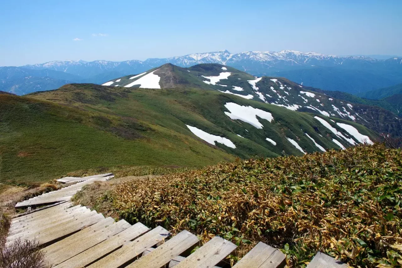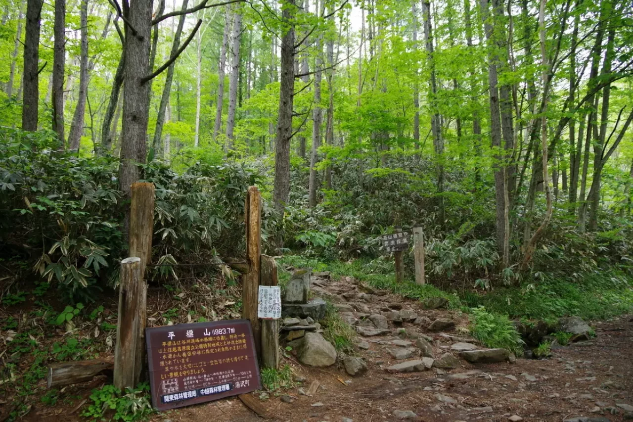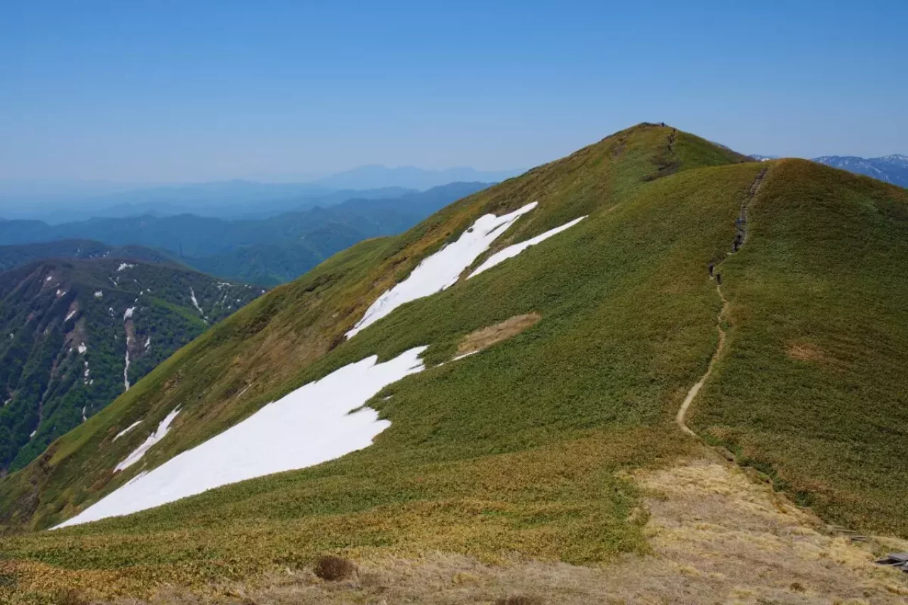 平標山は谷川連峰の西端に位置し花の百名山として知られます。標高は1,983m、谷川岳同様に気象の厳しさから標高1,500m付近が森林限界、その上は笹原が広がり視界が開けます。なので比較的低い標高でも高山植物が観察できます。登山ルートは湯沢町の国道17号沿いにある平標山(元橋)登山口から松手山を経ての登りが最もポピュラーなコース。平標山から谷川連峰の最高峰の仙ノ倉山(標高2,026m)への稜線歩きが人気です。このコースは稜線上からの景色がとても美しく、気持ちよく歩けます。