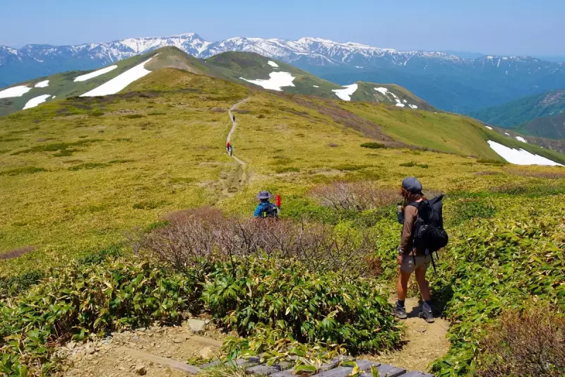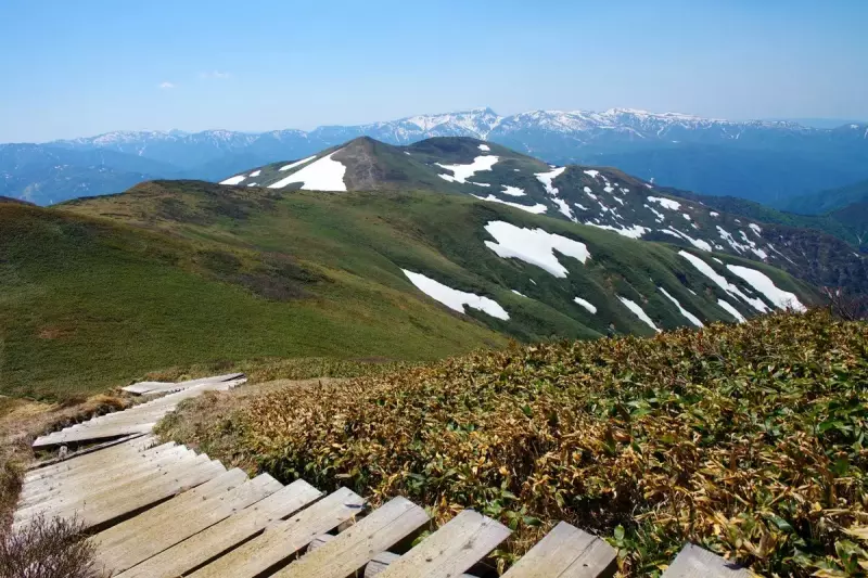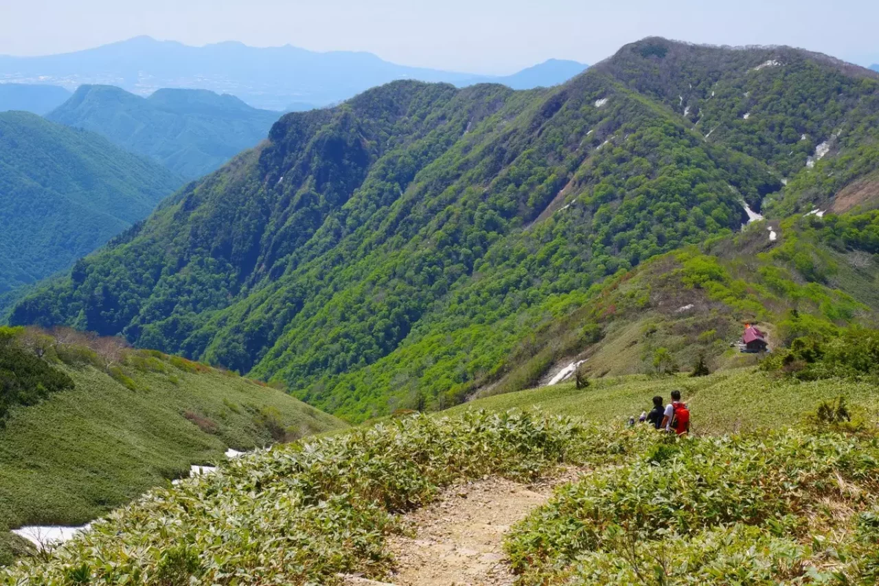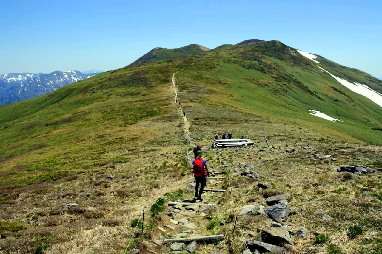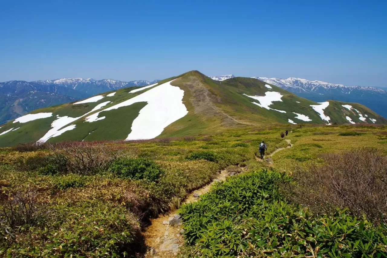 平標山は谷川連峰の西端に位置し花の百名山として知られます。標高は1,983m、谷川岳同様に気象の厳しさから標高1,500m付近が森林限界、その上は笹原が広がり視界が開けます。なので比較的低い標高でも高山植物が観察できます。登山ルートは湯沢町の国道17号沿いにある平標山(元橋)登山口から松手山を経ての登りが最もポピュラーなコース。平標山から谷川連峰の最高峰の仙ノ倉山(標高2,026m)への稜線歩きが人気です。このコースは稜線上からの景色がとても美しく、気持ちよく歩けます。