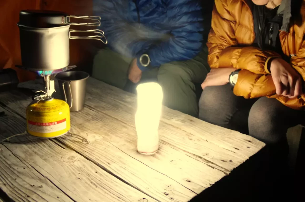 付属のポーチを被せれば光を優しく拡散すると同時に、ミニ三脚等を使わずに中型ランタン並みの配光高さとなります。