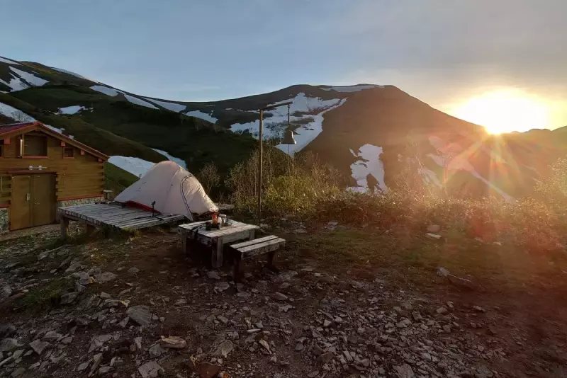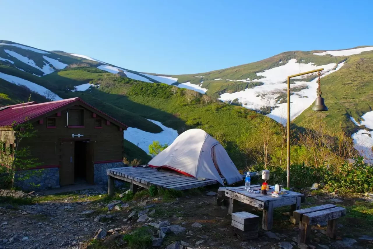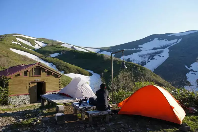 山の家は平成18年に新築されました。食事付きの宿泊が可能で事前予約が必要です。避難小屋泊、幕営は予約の必要はありませんがスペース、収容人数に限りがあるのでご注意ください。開設期間は4月29日から10月31日まで。