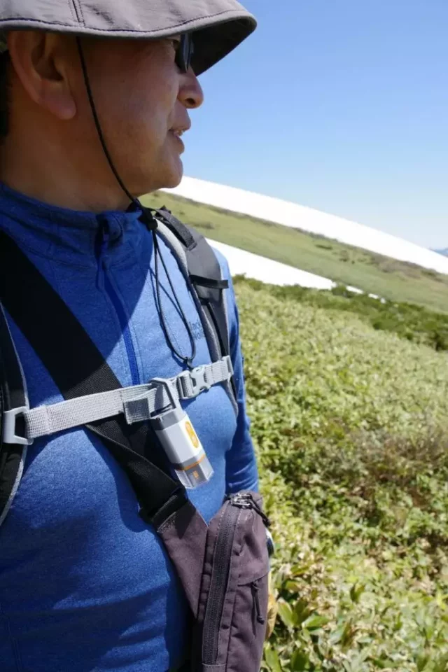 T田さん、翌日もモデルになって頂きました。63gのHEXAR UL3hはチェストベルトにぶら下げても全く負担がありません。この状態で足元と前方のみを照らす発光モードが有り、ヘッデンの代用としても使えます。